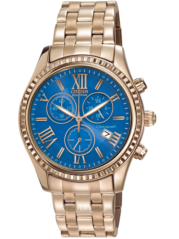 Citizen Eco-Drive technology harnesses the power of light – from any natural or artificial light source and converts it into energy which is stored in a permanently rechargeable lithium-ion cell. It recharges continuously in any kind of light to run forever. The stylish mix of refined contrasts; warm stainless steel rose gold tone and accents of sky blue across a deep blue dial make this timepiece a must have for the fashion forward. Additional features include a 1 second chronograph that measures up to 60 minutes, 12/24 hour time and a date feature.