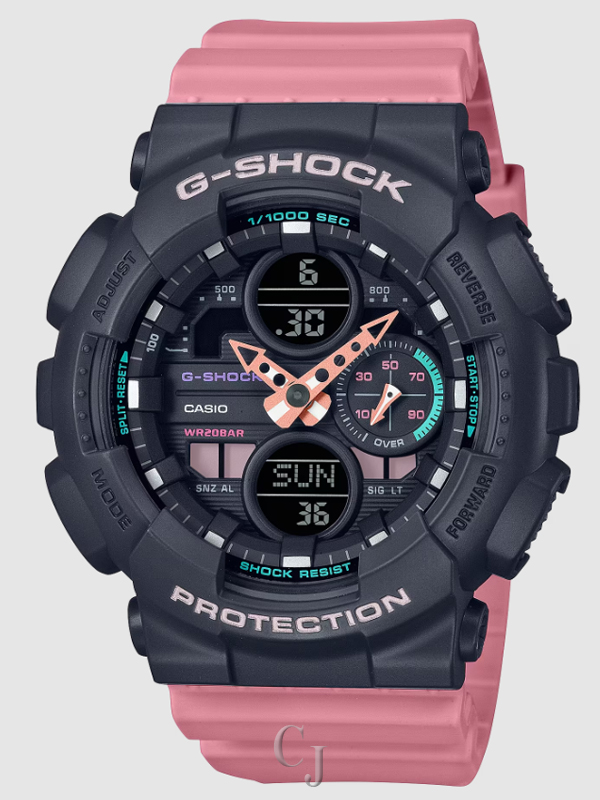 Uses a mid-size version of the popular digital-analog GA-140 as a base model, with the inside of the dial finished in a pleasing poppy color scheme. A trendy smaller G-SHOCK perfect for youth culture.