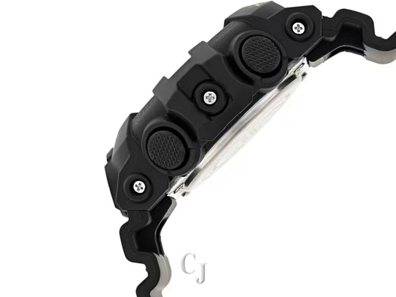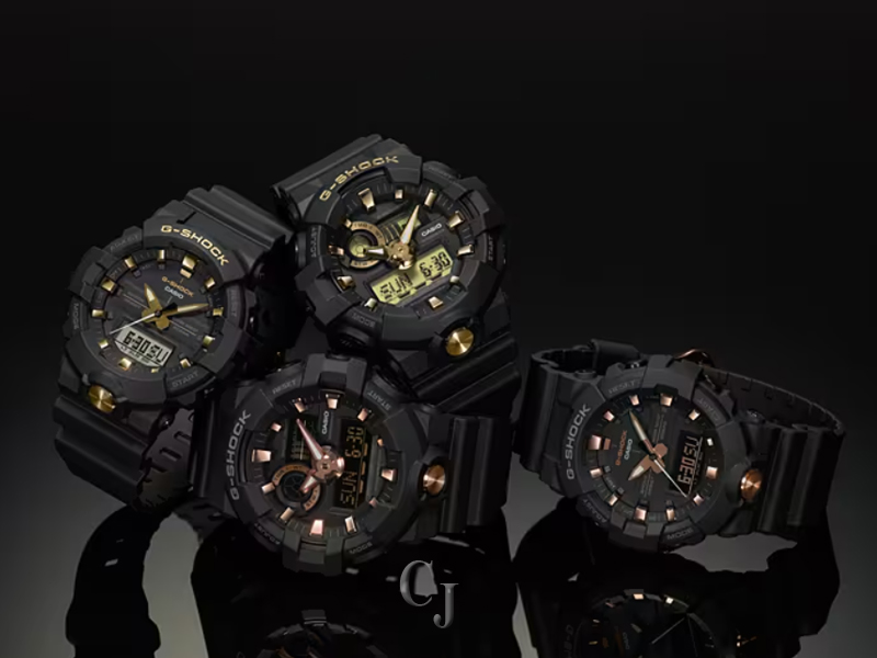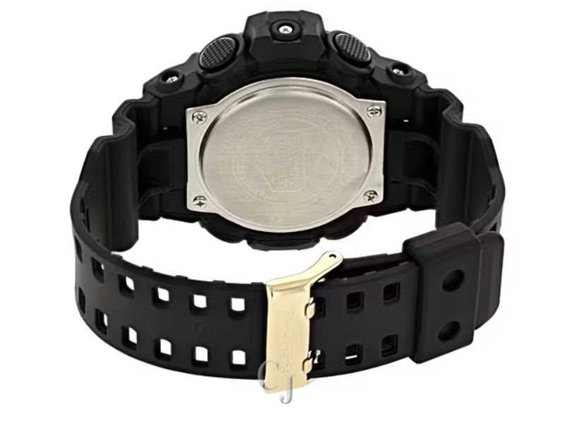 The G-SHOCK GA-700 Series Black Dial with Gold Accents Watch (model GA-710B-1A9) is a tough and stylish timepiece. Made with a durable resin case and bezel, it’s shock-resistant and can go underwater up to 200 meters. The black dial with gold details gives it a bold look. It has practical features like world time, a 1/100-second stopwatch, a countdown timer, and five daily alarms. The LED light ensures visibility in the dark. With a battery life of around five years, this watch is a reliable and functional accessory for everyday wear.