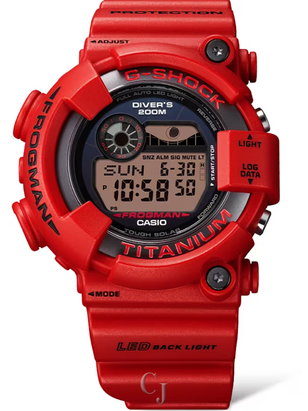 The third commemorative model to mark the 30 years since the first FROGMAN made a splash in 1993, this limited-edition timepiece revisits the bold design of the DW-8200NT debut in 2000 — the iconic asymmetrical FROGMAN shape with striking red band, bezel, and LCD.
