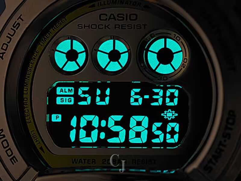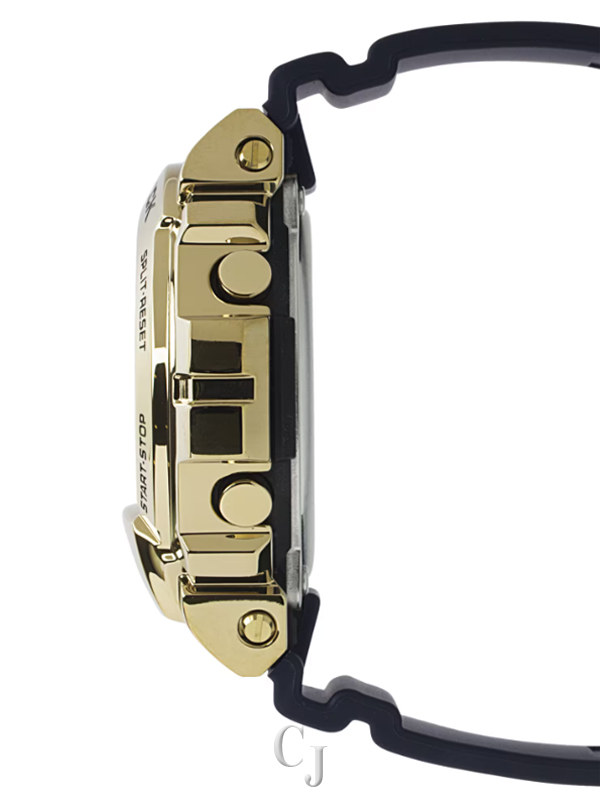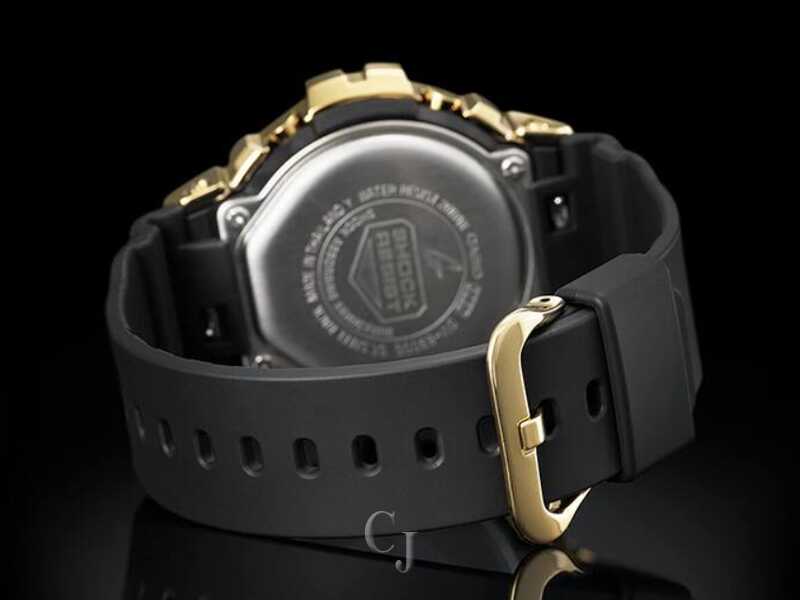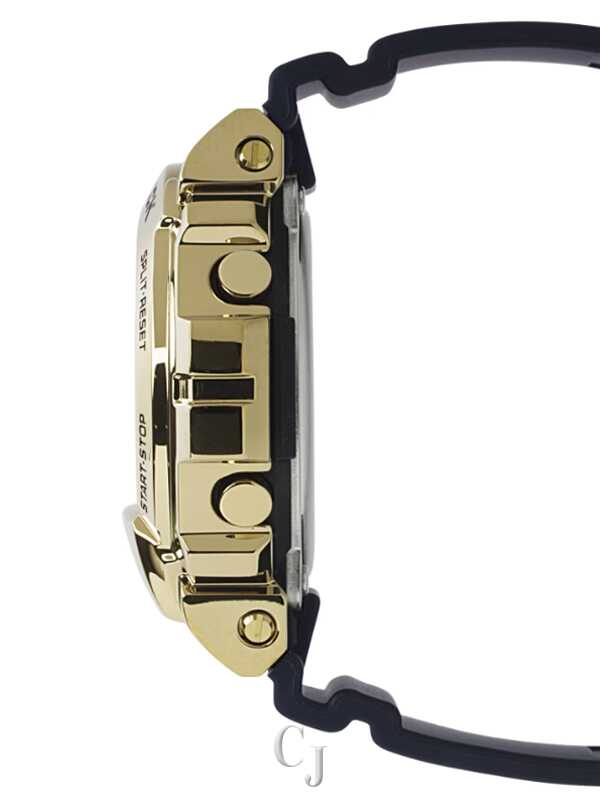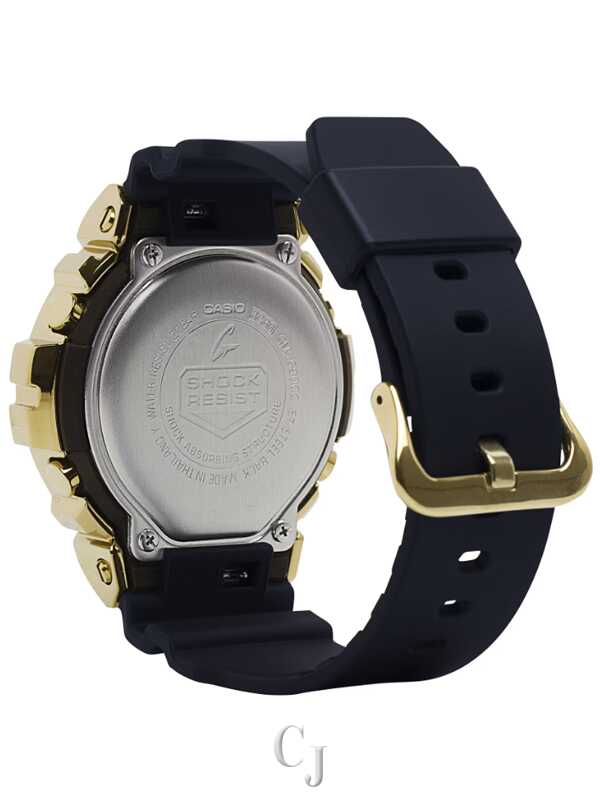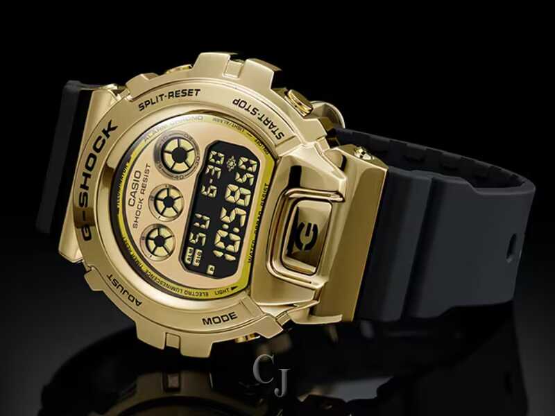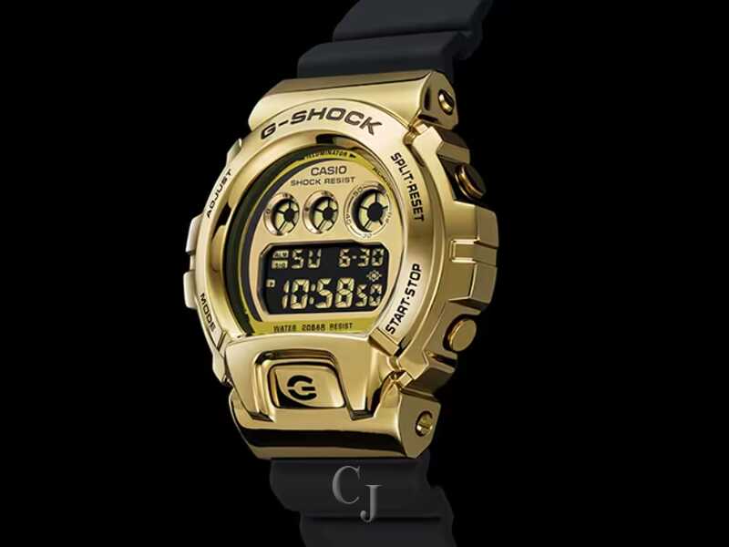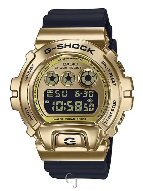 The G-SHOCK Metal Covered 6900 Series Gold Dial Watch (model GM6900G-9) is a tough yet stylish timepiece with a metal bezel for a touch of luxury. It maintains a casual look that fits street fashion trends. The watch is shock-resistant, water-resistant up to 200 meters, and features a gold ion-plated bezel. Powered by a CR2016 battery with a 2-year lifespan, it includes practical functions like a stopwatch, countdown timer, multi-function alarm, and a flash alert with both visual and audible signals. The blue-green electro-luminescent backlight ensures visibility in the dark. With reliable accuracy and a full auto-calendar, this G-SHOCK watch is a durable and fashionable accessory.