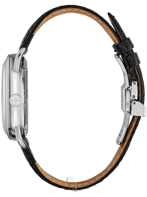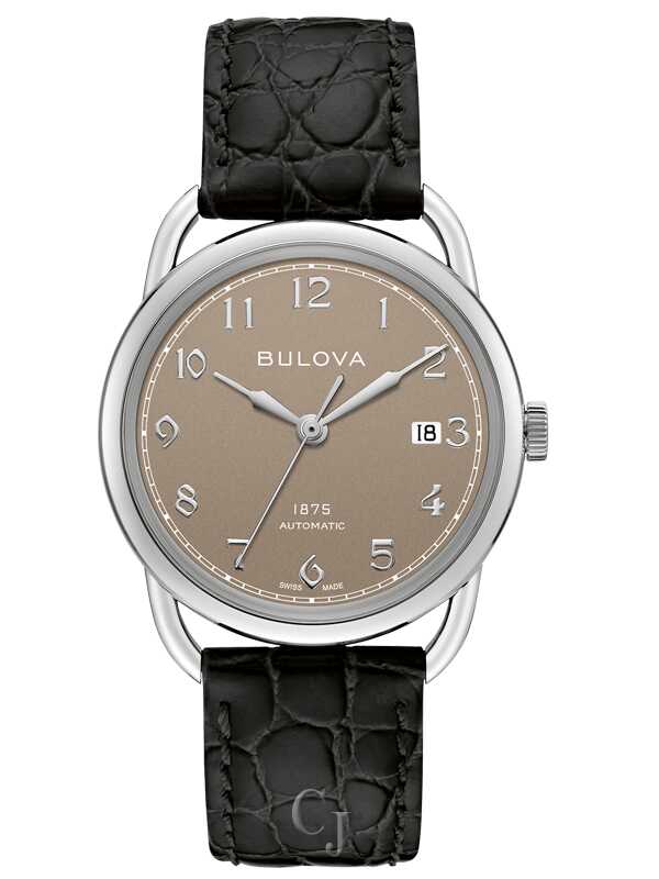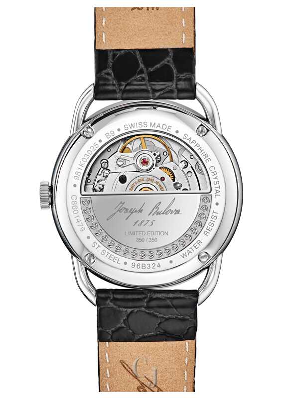 The Joseph Bulova Collection pays homage to the brand’s visionary founder. Stainless steel case with a brown sandblasted dial and applied markers. Open case back showcasing the fine Swiss made 26-jewel automatic movement, featuring the Joseph Bulova signature, “1875” and “Swiss Made”, and a custom-designed rotor. Black leather alligator grain strap with the “Joseph Bulova” signature on the interior lining and a deployant closure with pushers. Box sapphire crystal with anti-reflective coating. 38-hour power reserve. Limited to 350 pieces.