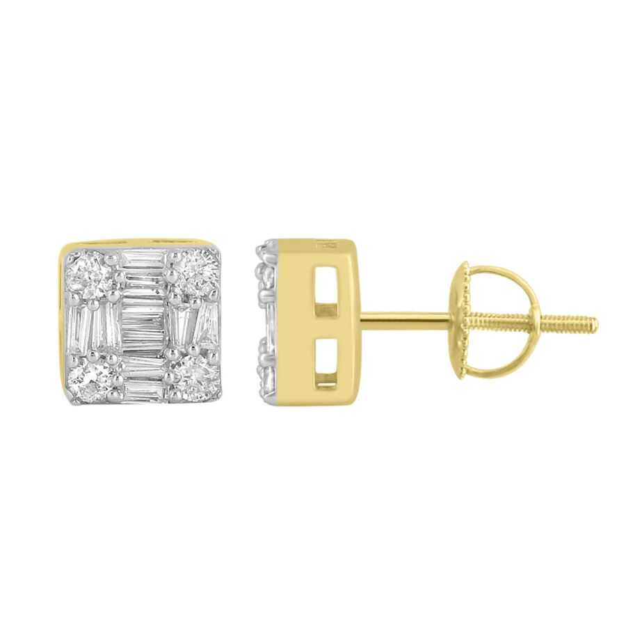 LADIES STUD EARRINGS 0.50CT ROUND/BAGUETTE DIAMOND 10K YELLOW GOLD