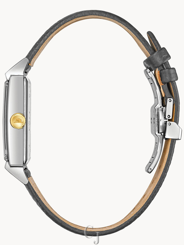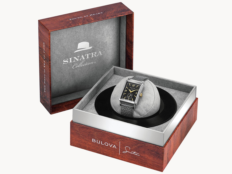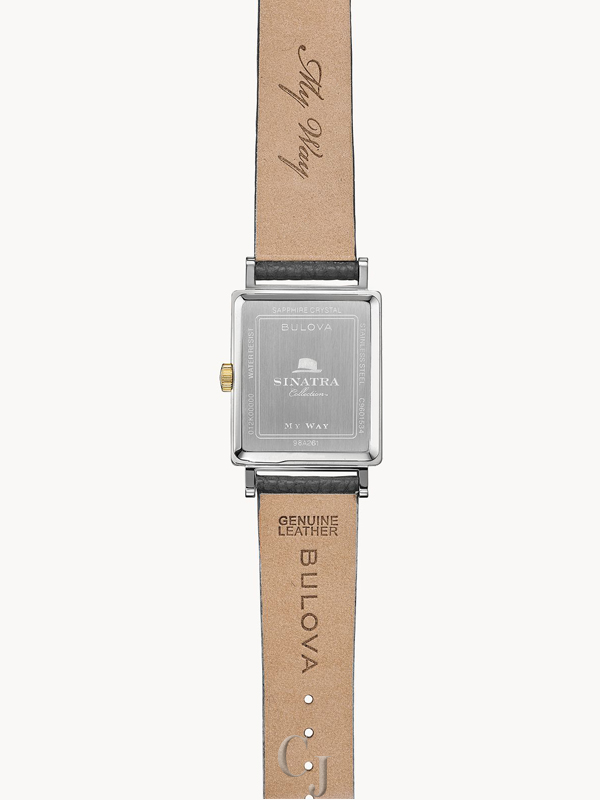 Incorporating vintage Bulova designs with the unmistakable elements of legendary performer, Frank Sinatra, the ‘My Way’ watch features a stainless steel rectangular case with a black dial, gold-tone hands and markers. Frank Sinatra’s signature is displayed under the Bulova logo and his iconic Fedora hat is etched on the gold-tone crown, as well as on the caseback along with the name, ‘My Way’. A distinct second hand sub sweep adds an elegant touch. The gray textured leather strap features a deployant buckle and is stamped with ‘My Way’ along the inside. Watch features a curved sapphire crystal and water resistance to 30 meters.