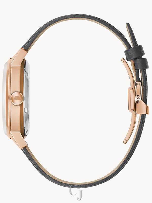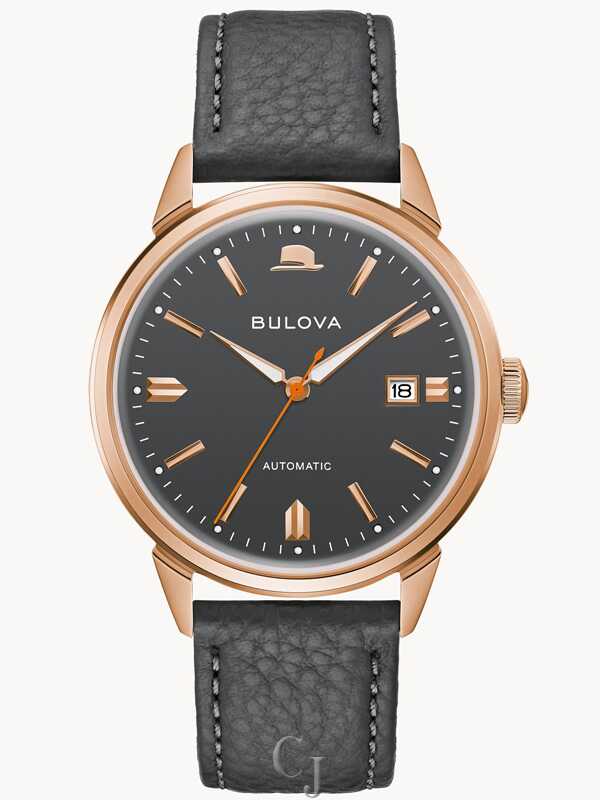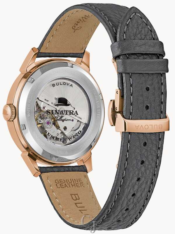 Be impeccably dressed with a Frank Sinatra timepiece on your wrist. Incorporating vintage Bulova designs with the iconic elements of the legendary performer, ‘Summer Wind’ is the newest addition to our collection of timepieces that pay tribute to Frank Sinatra’s most famous songs. This collector’s watch has a classic elegance like Sinatra himself and features a rose gold-tone stainless steel case, rose gold-tone hands and markers on a dark gray dial. It also features a self-winding 21-jewel automatic movement with a 42-hour power reserve and calendar. Sinatra’s classic fedora is displayed on the dial, finished with a domed sapphire crystal with AR coating. The exhibition case back showcases the fine movement and features the song title. The dark gray textured leather strap is stamped with the song title along the inside and features a double-press deployant buckle closure. Water resistant to 30 meters.