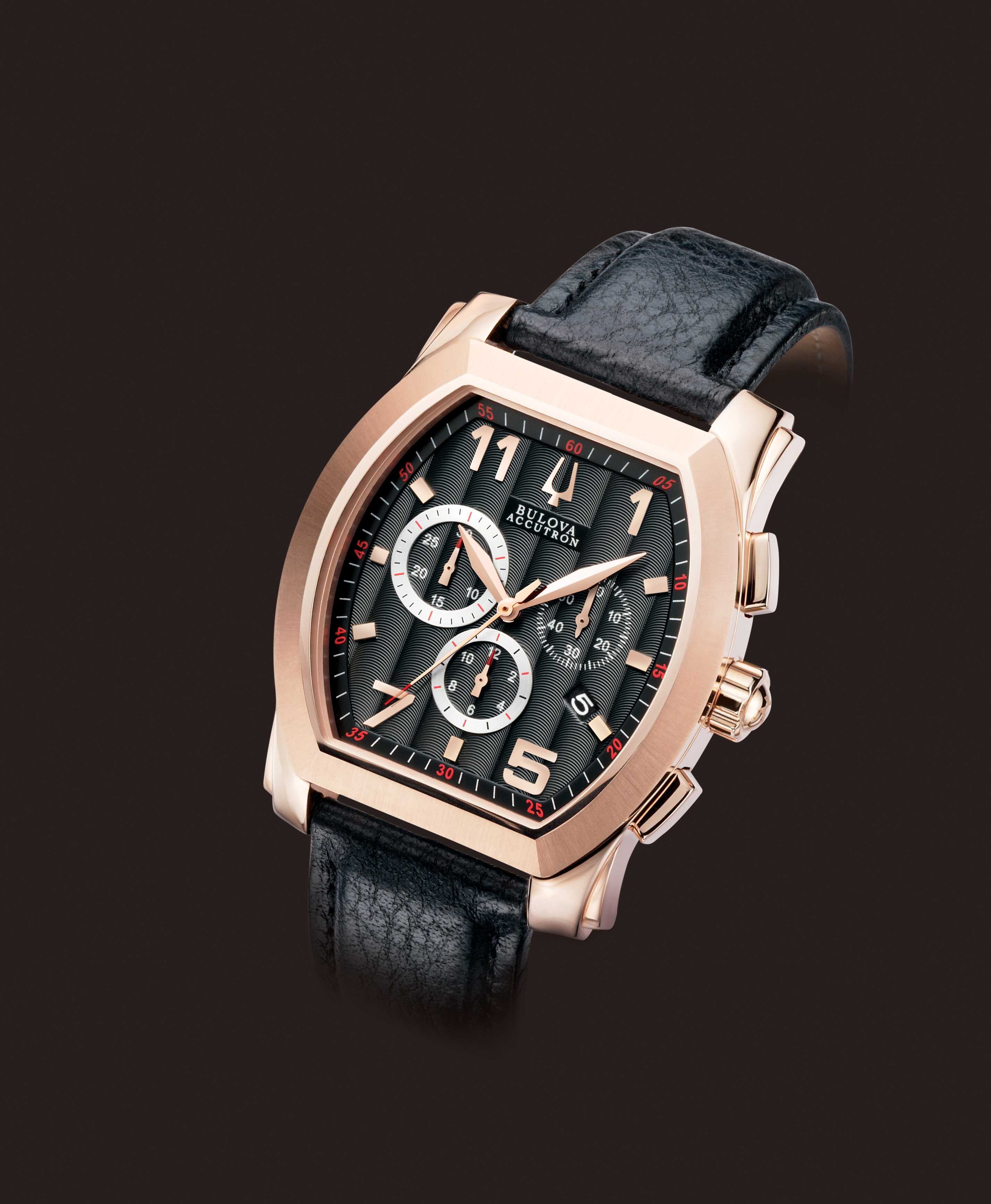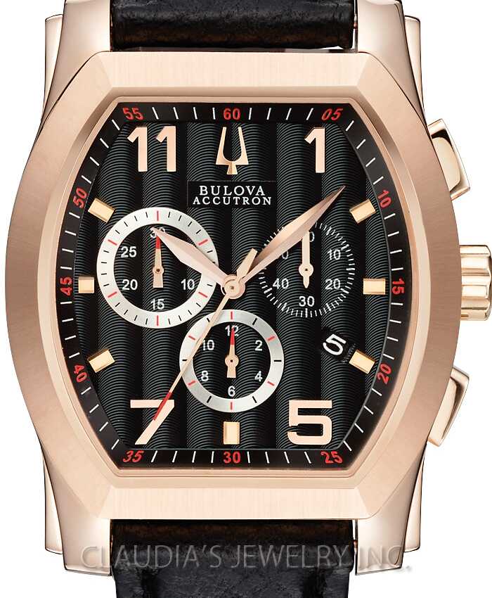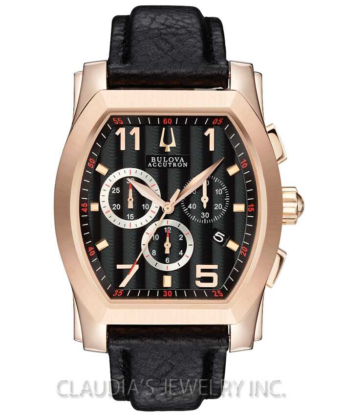 Bulova Watch Accutron Stratford Chronograph 64B114. The authentic story continues with classic confident designs. Since 1875, Bulova has been renowned for artistry and innovation, and aimed for superb craftsmanship and advanced technology. Blending chronograph precision and tailored lines, this classic Swiss-made design from the Bulova Accutron Stratford Collection, with curved tonneau-shaped case and anti-reflective sapphire crystal, is crafted in stainless steel with rose-gold ion-plated finish, black Cotes de Genève patterned dial, calendar, four-screw caseback, black leather strap, double-pusher deployment buckle and water resistance to 50 meters.