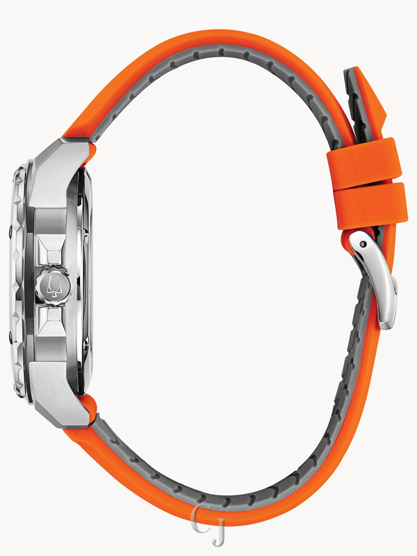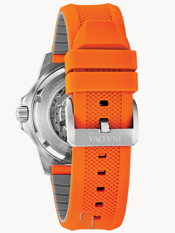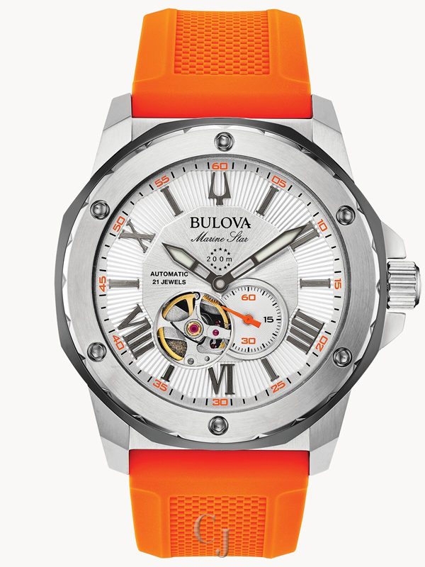 Introducing the new Marine Star featuring a three-hand automatic movement showcased in an open aperture. Silver tone stainless steel case with grey tone outer ring. Silver white dial with flat mineral crystal. Orange textured silicone strap with a contrasting grey underside. Water resistance to 200 meters.