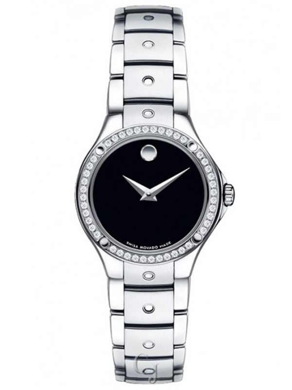 Highly polished solid stainless steel case and bracelet. Black museum style dial with dot at 12 o`clock. Diamond bezel. Sapphire crystal. Women’s watch,stainless steel case with diamonds, black Museum® dial, stainless steel link bracelet, Swiss quartz movement. The watch is adorned with 44 diamonds of top VS quality, Dial color: Black, Glass: saphire.