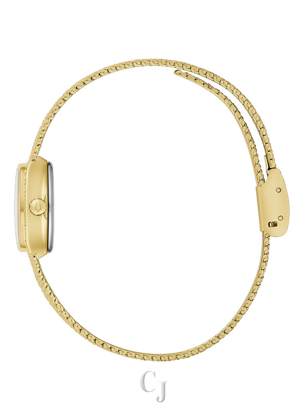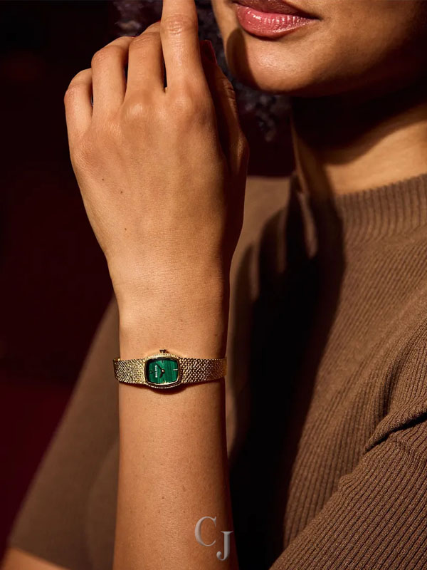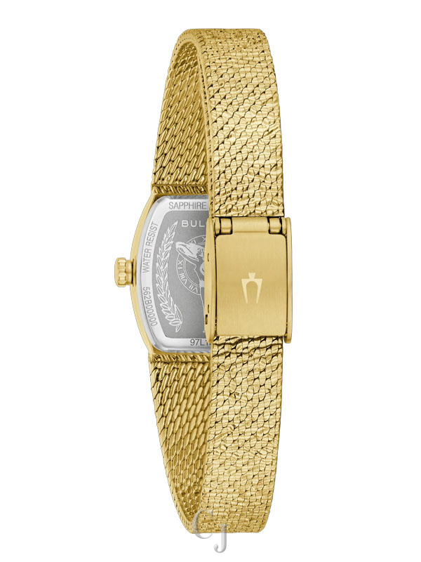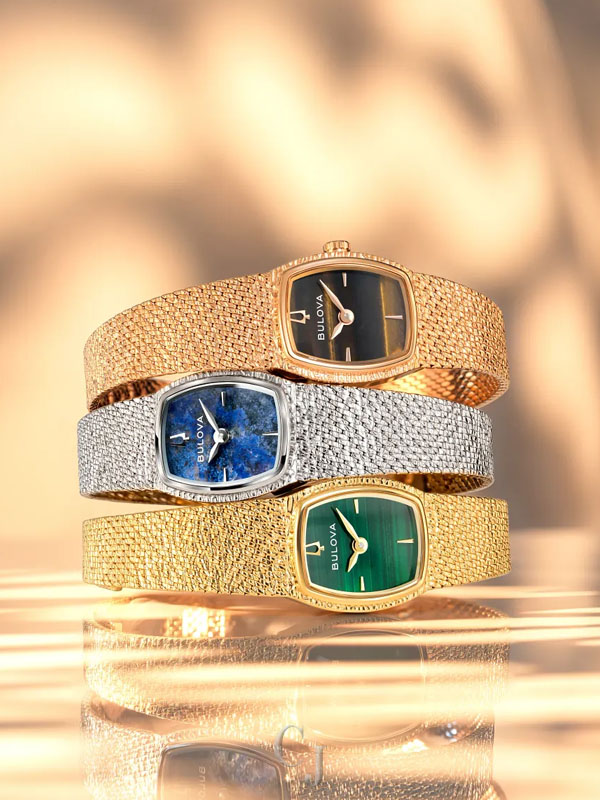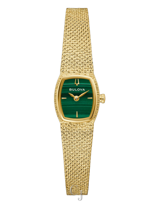 Step back in time to the glitz and glam of the 1970s with the Bulova women’s Classic “Goddess of Time” watch. Borrowing the timeless design of vintage Bulova “Goddess of Time” watches, the gold-tone stainless steel tonneau case has a textured top and a brightly polished bezel, seamlessly transitioning to a textured mesh bracelet with a sliding clasp closure that adjusts from 6″ to 7 ¾″. Each striated green genuine malachite dial is completely unique and is appointed with gold-tone applied markers and matching hands, while Bulova’s Goddess of Time herself is etched onto the case back in intricate definition. Feel truly divine in this stunning Bulova ladies’ timepiece.