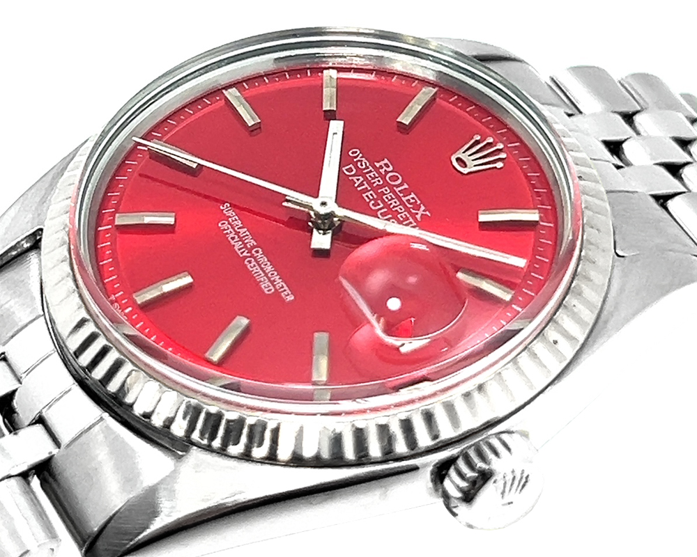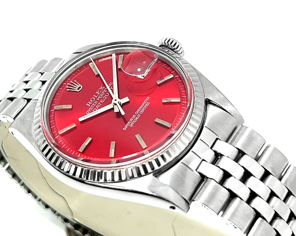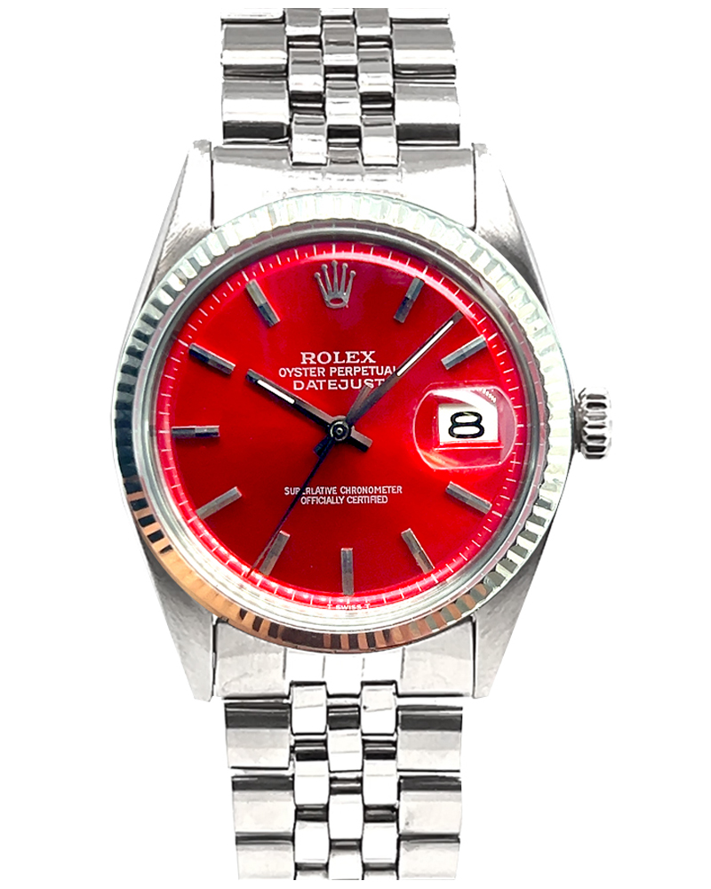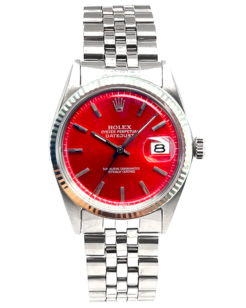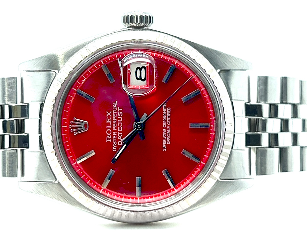 Introducing the Rolex Datejust 1601, an exceptional timepiece featuring a 36mm stainless steel case and a striking custom red dial. This unique watch boasts a solid white gold fluted bezel and a stainless steel Jubilee bracelet, secured with a traditional Rolex clasp. The automatic self-winding movement ensures precision, while the scratch-resistant sapphire crystal with a Cyclops magnifier at 3 o’clock enhances readability. Water-resistant up to 100 meters, this watch combines durability with luxury. In very good condition, and it comes with a box. Perfect for those who appreciate classic elegance with a distinctive flair.