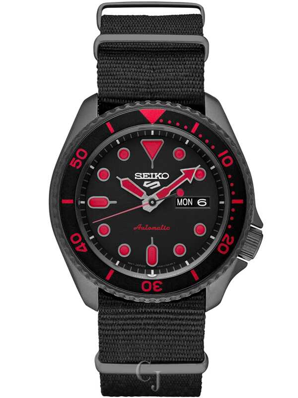 The SEIKO 5 Sports Collection is a true classic automatic timepiece and must have favorite staple for any true watch enthusiasts. The SRPD83 automatic 42.5mm brushed and polished stainless steel black ion finished case has manual wind capacity with hack function for precision setting. The black sunray finished dial has matching black aluminum rotating uni-directional bezel with red accents. Equipped with a double day/date window @3 with minutes track on outer chapter ring and luminous arrow style hands and markers for easy legibility. Has 100 meter water resistance with a black ion finished stainless steel crown nestled between a crown guard strategically positioned at 4:00 for increased comfort. Powered by Seiko’s own in-house-made automatic caliber 4R36 movement viewable behind the exhibition case-back with 41 hour power reserve. Fitted with a black nylon NATO style strap with stainless steel tang buckle to keep your watch secure and in place.