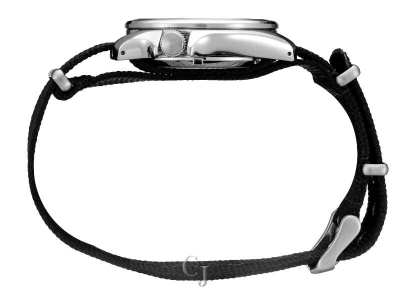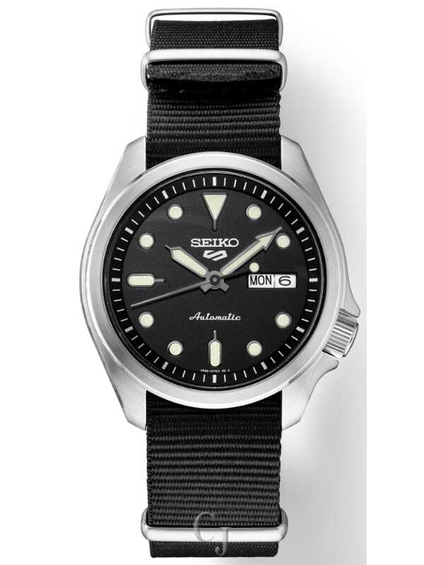 This is a new Seiko automatic 5 Sports watch that features a Seiko 4R36 automatic (self-winding, hand wind, hacks) movement. The black dial has a day and date display at 3:00 and highly luminous hands and hour markers treated with Lumibrite. The crown is offset at 4:00 on the 40mm diameter stainless steel case. There is also an exhibition window (screw-down) case back for viewing the automatic movement. It comes on a matching black nylon military-style band. Lug width is 20mm. Water resistance is 100 meters. A manual and Seiko box are included.