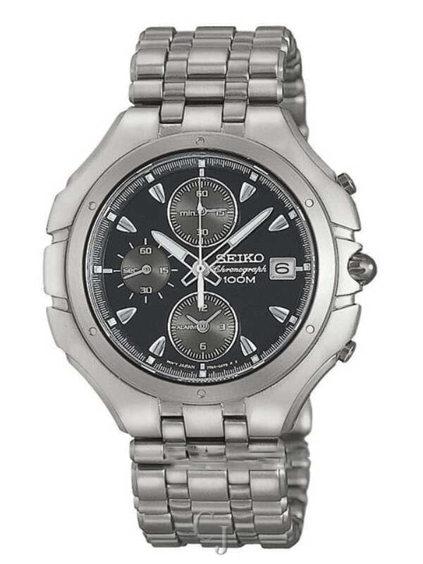 Seiko men’s Arcadia alarm chronograph in ultra-light, ultra-strong titanium. Strapping brushed titanium case is fully integrated into the distinctive link bracelet in brushed titanium. Satin finished bezel frames the black dial with three gray subdials, luminous hands and hour markers. Small seconds, 30-minute and alarm registers. A window at the 3 o’clock hour reveals the automatic date calendar. Scratch resistant sapphire crystal. Bracelet has a push-button, double locking clasp for added convenience. Water resistant to 100 meters (330 feet). Case is 41mm in diameter and 9.5mm thick.
