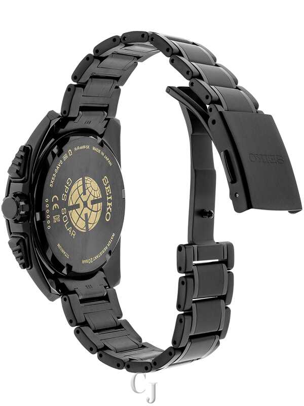 Astron 5X Titanium Collection. Fifty years ago, Seiko transformed watchmaking with the first commercially available quartz watch, the Astron. Today’s Astron Titanium Collection represents another step forward, reflecting the strong, sleek lines of the 1969 original, in light and durable titanium, while providing the highest degree of accuracy possible in a wristwatch — effortlessly. GPS controlled for high-speed time and time zone adjustment to 39 time zones, with daylight saving time function, this remarkable timepiece includes a perpetual day and date calendar correct to the year 2100, dual time with time transfer function, and am/pm indicators. To ensure smooth operation, the watch is equipped with a signal reception result indicator and power save function. The solar cell is powered by light energy, with no battery change required. The black dial also features a date calendar and LumiBrite hands and markers, and is topped by a dual-curved sapphire crystal with super-clear coating. A unique crown and pusher design provides easy gripping. Crafted of stainless steel with a black super-hard coating for added durability, secure screwdown caseback, and tri-fold push button release clasp. 20 bar, 200M Water Resistant.