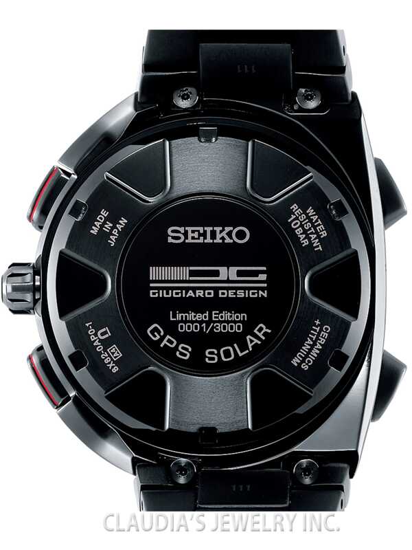 | Movement |  GPS Solar Chronograph, GPS controlled time and time zone adjustment,Chronograph measures up to 6  hours in 1/5 second increments, Accuracy +/- 15 seconds per month without receiving a time signal,  Magnetic resistance 4,800A/m Perpetual calendar correct to the year 2100, Signal reception result  indication,World time function (40 time zones) Daylight savings time function, Power save function,  Sapphire glass with Seiko’s proprietary super clear, anti-reflective coating Tri-fold push button release clasp,  LumiBrite hands and markers 46.3mm diameter,Water-resistant to 10 bar, 100 meters (330 feet) Caliber  8X82, Giugiaro Limited Edition: 3,000 pieces, Number engraved on caseback,Black ceramic bezel,Titanium  case and bracelet with super hard black coating. |
