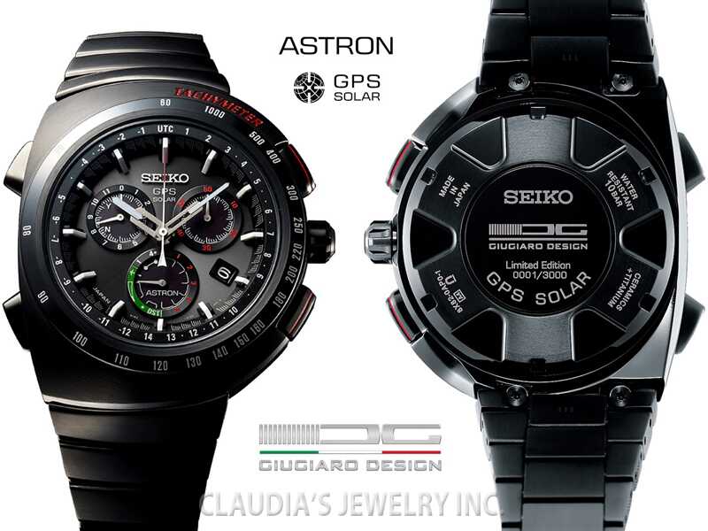GPS Solar Chronograph, GPS controlled time and time zone adjustment,Chronograph measures up to 6  hours in 1/5 second increments, Accuracy +/- 15 seconds per month without receiving a time signal,  Magnetic resistance 4,800A/m Perpetual calendar correct to the year 2100, Signal reception result  indication,World time function (40 time zones) Daylight savings time function, Power save function,  Sapphire glass with Seiko’s proprietary super clear, anti-reflective coating Tri-fold push button release clasp,  LumiBrite hands and markers 46.3mm diameter,Water-resistant to 10 bar, 100 meters (330 feet) Caliber  8X82, Giugiaro Limited Edition: 3,000 pieces, Number engraved on caseback,Black ceramic bezel,Titanium  case and bracelet with super hard black coating.