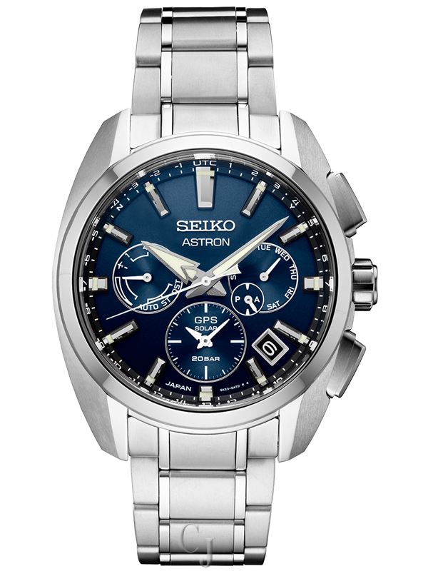 Astron 5X Titanium Collection. Fifty years ago, Seiko transformed watchmaking with the first commercially available quartz watch, the Astron. Today’s Astron 5X Titanium Collection represents another step forward, reflecting the strong, sleek lines of the 1969 original, in light and durable titanium, while providing the highest degree of accuracy possible in a wristwatch — effortlessly. GPS controlled for high-speed time and time zone adjustment to 39 time zones, with daylight saving time function, this remarkable timepiece includes a perpetual day and date calendar correct to the year 2100, dual time with time transfer function, and am/pm indicators. To ensure smooth operation, the watch is equipped with a signal reception result indicator and power save function. The solar cell is powered by light energy, with no battery change required. The blue dial also features a date calendar and LumiBrite hands and markers, and is topped by a dual-curved sapphire crystal with super-clear coating. Crafted of stainless steel with a super-hard coating for added durability, secure screwdown caseback, and tri-fold push button release clasp. 20 bar, 200M Water Resistant.