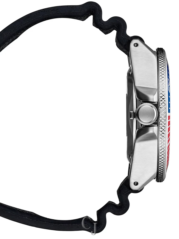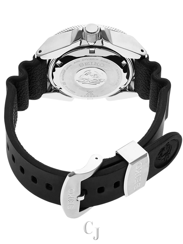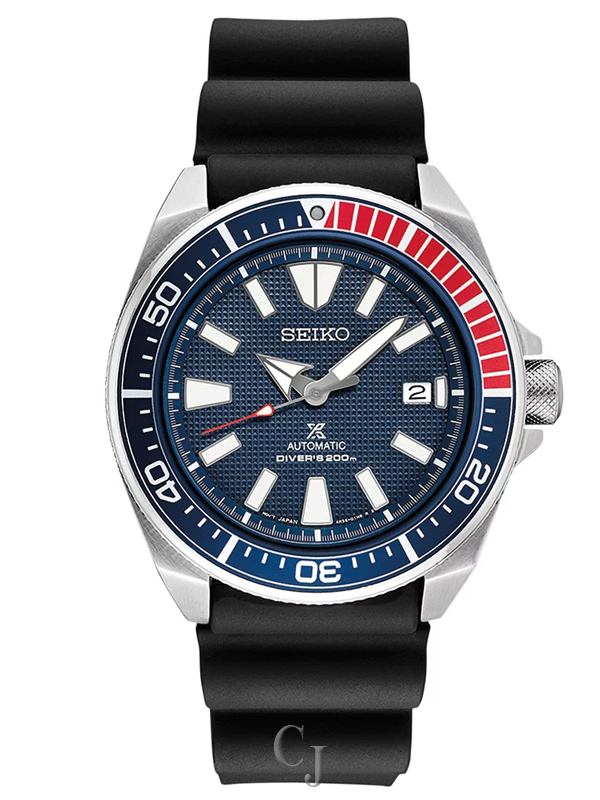 This is a new version of the Seiko automatic dive watch that is nicknamed Samurai. It features a Seiko 23 jewel automatic (4R35) movement, a date display, highly luminous hands and markers treated with Lumibrite for awesome low light visibility, a screw down offset crown, a uni-directional diving bezel with luminous PIP at 12:00, Hardlex mineral crystal and a solid etched, screw-down case back. The 4R35 Seiko movement is self-winding and it can be hand wound and hacked. The movement has a 41 hour power reserve.