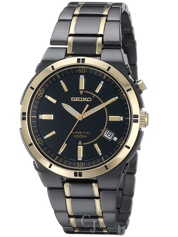 TiCN and gold-tone stainless steel case with a TiCN and gold-tone stainless steel bracelet. Fixed gold-tone bezel. Black dial with luminous gold-tone hands and index hour markers. Minute markers around the outer rim. Dial Type: Analog. Luminescent hands and dial markers. Date display at the 4 o’clock position. Seiko caliber 5M62 auto-quartz movement with about 6 months of power reserve. Scratch resistant Hardlex crystal. Skeletal case back. Case size: 39.5 mm. Case thickness: 11.2 mm. Round case shape. Band width: 20.5 mm. Push button deployment clasp. Water resistant at 100 meters / 330 feet. Functions: hours, minutes, seconds, date. Dress watch style.