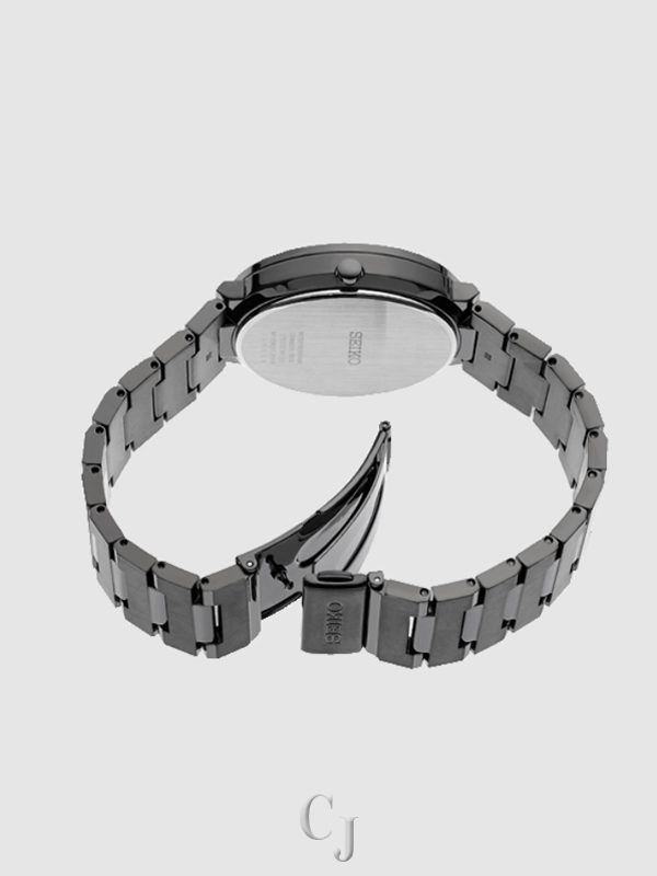 Black-plated stainless steel case and bracelet. Fixed black-plated bezel with a silver-tone ring. Black dial with silver-tone hands and index hour markers. Dial Type: Analog. Date display at the 3 o’clock position. Seiko Caliber V157 quartz movement with a 10-months power reserve. Scratch resistant Hardlex crystal. Pull / push crown. Solid case back. Round case shape. Case size: 40 mm. Case thickness: 9 mm. Band width: 20 mm. Fold over clasp with a push button release. Water resistant at 30 meters / 100 feet. Functions: date, hour, minute, second. Additional Info: powered by light energy- no battery change required. Casual watch style. Watch label: Japan Movt. Seiko Quartz Black Dial Men’s Watch SNE481.