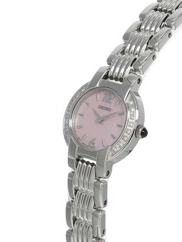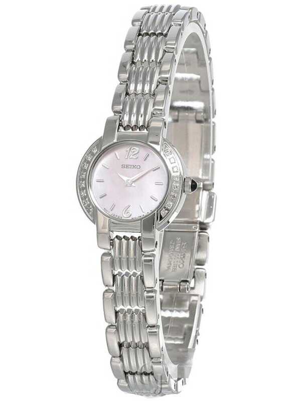 Seiko Watch: Seiko SUJC41 women’s watch features a brushed finish stainless steel case with 16 diamonds on the case. This great watch also comes with high quality quartz movement, highly scratch resistant hardlex crystal, water resistant up to 30 meters, brushed finish stainless steel bracelet with hidden push button deployment clasp and pink MOP dial.