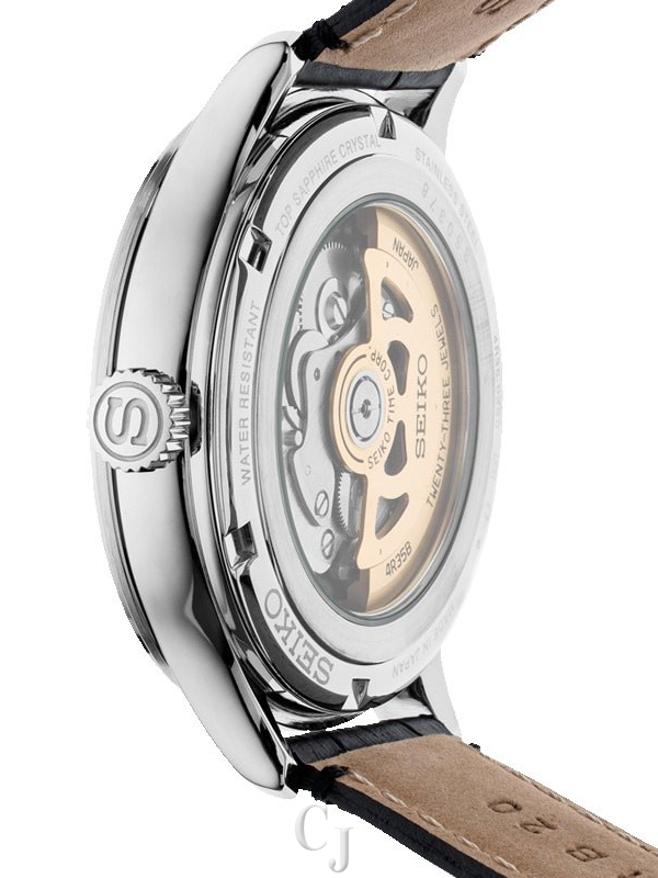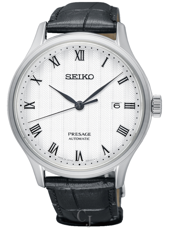 The Seiko Presage model SRPC83 is powered by the Seiko 4R35 caliber self-winding movement that can also be hand wound and hacked. The 41.7mm diameter case has a beautiful patterned white dial with black hands and black Roman numeral hour markers. A date display