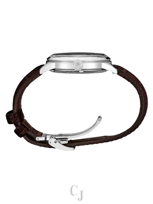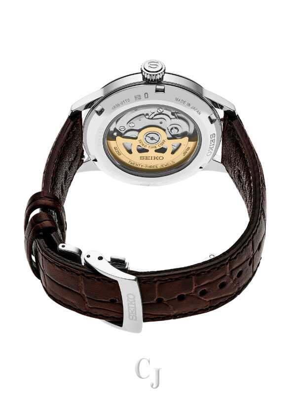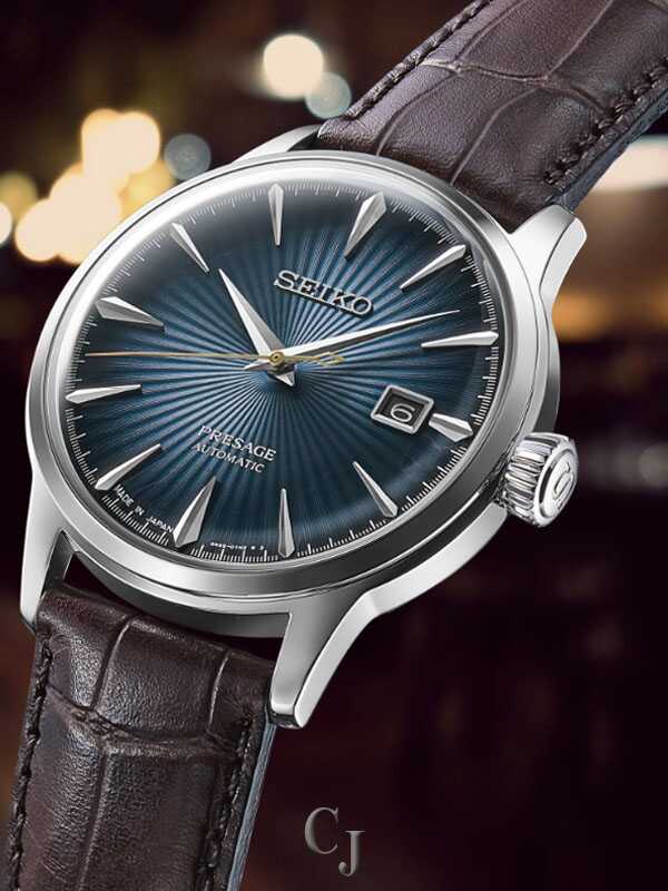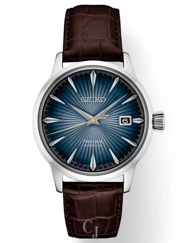 Seiko Presage Cocktail Time. Offering the finest in Japanese mechanical watchmaking, the Presage Collection blends precision technology with superior craftsmanship and design. Inspired by the vibrance of the city’s modern lounges, the newest Cocktail Time designs express the excitement of today’s Tokyo, with fresh styling and colors. Highlighted by a brilliant blue dial with gradated tones, pressed pattern and gloss finish evoking the Blue Moon cocktail, this elegant design features a 23-jewel automatic movement, with manual winding capability, that beats at a frequency of 21,600 vibrations per hour, with a power reserve of approximately 41 hours. Crafted of stainless steel, with brown leather strap, this distinctive timepiece includes a calendar, box-shaped crystal, screwdown see-through caseback, and tri-fold push button release clasp. 5 bar, 50M Water Resistant.