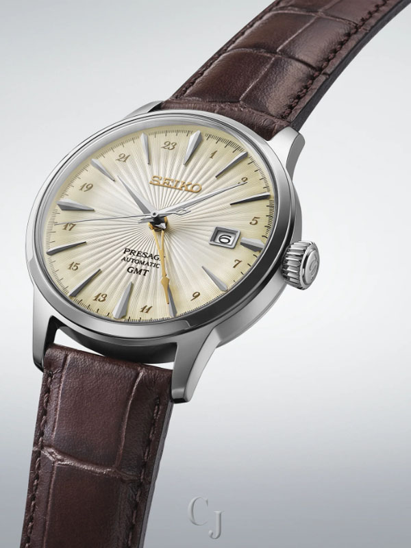 Presage Cocktail Time GMT. Offering the finest in Japanese mechanical watchmaking, the Presage Collection blends precision technology with superior craftsmanship and design. Inspired by the vibrance of the city’s modern lounges, the newest Cocktail Time designs express the excitement of today’s Tokyo, with fresh styling and colors. Evoking the Acacia cocktail, the ivory dial features a deep pressed pattern with a lustrous gloss finish accented with a gold-tone GMT hand designed in the shape of a cocktail glass, while beautifully displaying a cursive-style Arabic numeral 24-hour scale. The 24-jewel automatic GMT movement, visible through the screwdown see-through caseback, beats at a frequency of 21,600 vibrations per hour with a power reserve of approximately 41 hours. Crafted of stainless steel and paired with a dark brown leather strap, this distinctive timepiece includes a date calendar, box-shaped crystal, and tri-fold clasp with push button release. 5 bar, 50M Water Resistant
