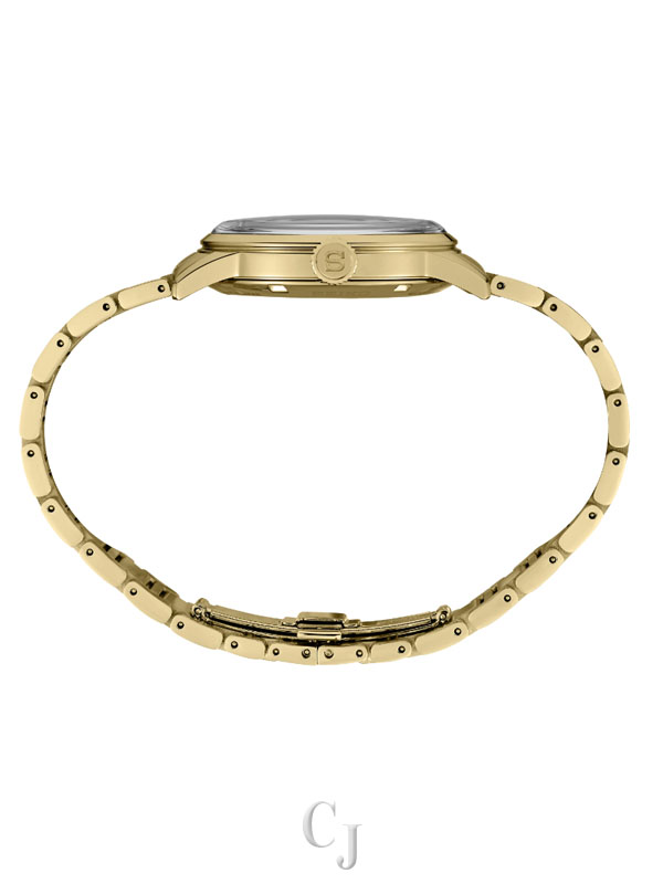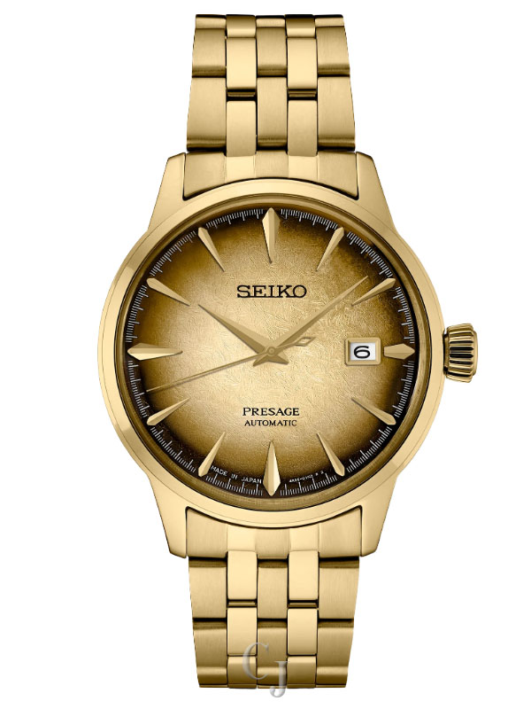 Seiko Presage Cocktail Time U.S. Special Creation now available in select markets globally. Offering the finest in Japanese mechanical watchmaking, the Presage Collection blends precision technology with superior craftsmanship and design. Celebrating craft beer cocktails, as one of the first two watches in the Cocktail Time Collection to offer a gold case and bracelet finish, this shimmering design, inspired by the Half and Half cocktail, is highlighted by a gloss-finish gold and brown dial with radial gradations to suggest the distinct hues of a fresh pour, while the pressed pattern evokes its bubbling effervescence. The 23-jewel automatic movement, visible through the screwdown see-through caseback, beats at a frequency of 21,600 vibrations per hour, with a power reserve of approximately 41 hours and manual winding capability. Crafted of stainless steel, this distinctive timepiece includes a calendar, box-shaped crystal, and deployment clasp with push button release. 5 bar, 50M Water Resistant.