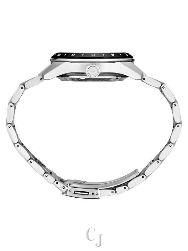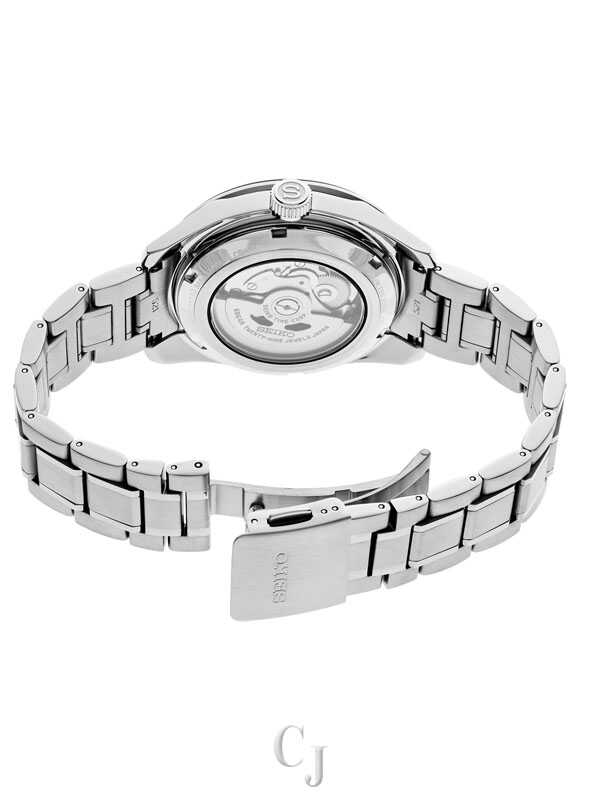 Presage Sharp-Edged Series GMT. Offering the finest in Japanese mechanical watchmaking, the Presage Collection blends precision technology with superior craftsmanship and design. Known for unique dials reflecting centuries of artistry, Presage embraces the fresh look of contemporary Japanese design with this coolly angular timepiece. The theme of energy is captured by the intricate dial pattern, based on the traditional Asanoha hemp leaf motif of the Heian Period (794-1185 AD), a symbol of growth and prosperity. Uniquely shaped LumiBrite hands and stick markers add a crisp legibility to the Tokiwa green GMT dial, with 24-hour GMT hand, power reserve indicator and date display. A sapphire crystal includes anti-reflective coating on the inner surface, while the screwdown see-through caseback provides a view of the caliber 6R64 29-jewel automatic movement with manual winding capability, a frequency of 28,800 vibrations per hour and a power reserve of approximately 45 hours. With clean, sharp angles to highlight the beauty of the material, this bracingly modern watch is crafted of stainless steel with super-hard coating and tri-fold push button release clasp. 10 bar, 100M Water Resistant.