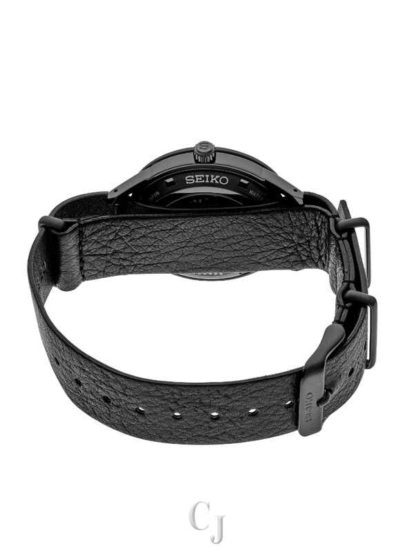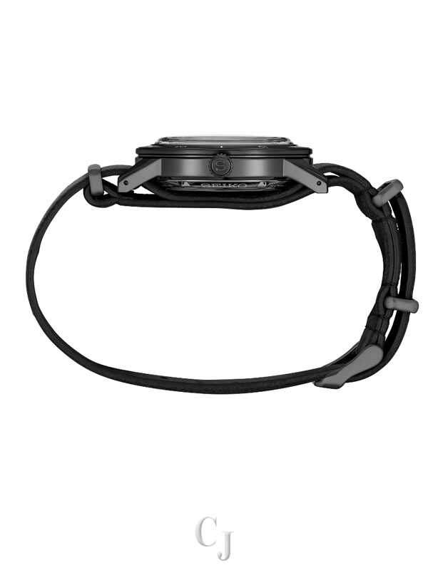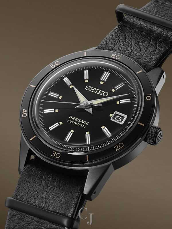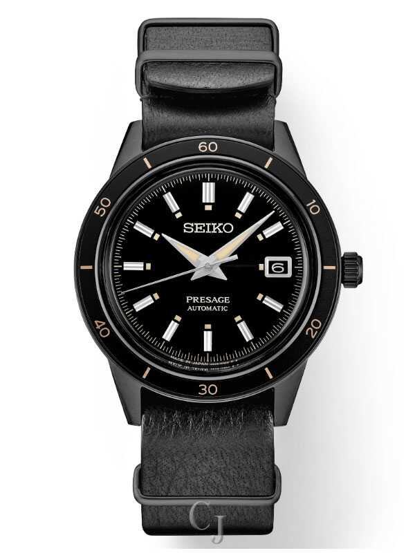 Presage Style60’s Collection. Offering the finest in Japanese mechanical watchmaking, the Presage Collection blends precision technology with superior craftsmanship and design. With broad angular lines and such vintage details as box-shaped crystals, faceted indices and sharp hand design, plus the use of neutrals and earth tones, the Style60’s collection creates a warm, retro feel. Celebrating the fresh spirit of the 1960s, the collection takes particular inspiration from Seiko’s 1964 “Crown Chronograph,” Japan’s first watch with a stopwatch function. Framed by a black bezel, the black dial of this dramatic timepiece features a date calendar, as well as beige LumiBrite hands and markers. The screwdown see-through caseback provides a view of the 23-jewel movement with manual winding capability, a frequency of 21,600 vibrations per hour and a power reserve of approximately 41 hours. Crafted of stainless steel with black hard coating, this exceptional watch includes a black deerskin strap, and a box-shaped crystal. 5 bar, 50M Water Resistant.