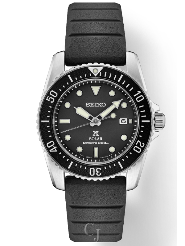 From the Prospex Collection, Solar diver’s watch, Powered by light energy – no battery change required, 10-month power reserve once fully charged, Black unidirectional rotating elapsed timing bezel, Black dial, Date calendar