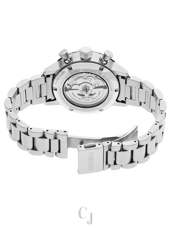 Prospex Speedtimer Limited Edition Mechanical Chronograph. Designed for those who treat life as the ultimate adventure, the Seiko Prospex line meets every challenge with technological excellence and style. Available only in a limited edition of 1,000, with the serial number engraved on each caseback to show its position in a controlled production run, this exceptional watch celebrates Seiko’s first precision chronographs, developed for international sporting competitions in 1964, as well as its 1969 introduction of the world’s first automatic chronograph. Providing chronograph measurement of up to 30 minutes of elapsed time in 1/8-second increments, the 34-jewel automatic movement, visible through the screwdown see-through caseback, beats at a frequency of 28,800 vibrations per hour, with a power reserve of approximately 45 hours and manual winding capability. The proprietary 8R46 movement includes a column wheel and vertical clutch mechanism allowing for smooth, stutter-free movement of the chronograph hand while providing longer wear and efficiency, and maintaining the power reserve better during chronograph operation. Crafted of stainless steel with super-hard coating and tri-fold push button release clasp, this extraordinary timepiece also features a clean white dial with hairline finish and LumiBrite hands and markers, topped by a dual curved anti-reflective sapphire crystal. An additional black leather strap is included in the special collectors’ box. 10 bar, 100M Water Resistant