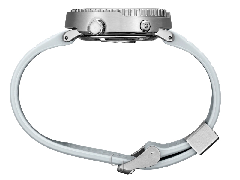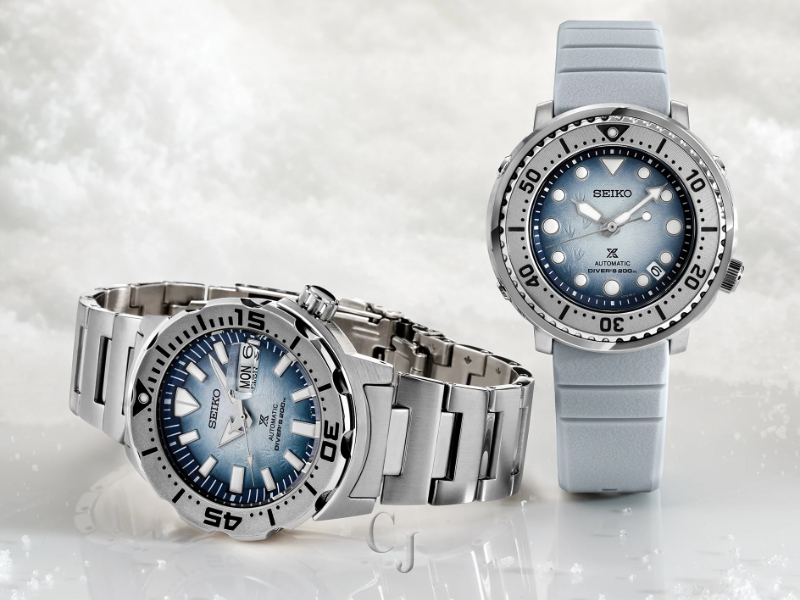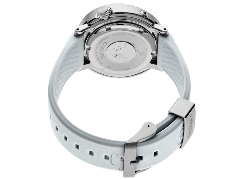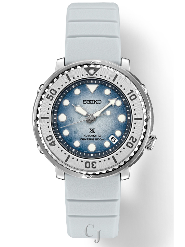 Prospex Save the Ocean Special Edition, Special Edition supporting conservation efforts to save the ocean, Gradient die-stamped dial evoking the whites and blues of light reflecting off Antarctic ice and the patterns of penguin footprints in the snow, Automatic diver with manual winding capability, 21,600 vibrations per hour, Power reserve: approximately 41 hours, 23 jewels, Unidirectional rotating elapsed timing bezel, Date calendar, LumiBrite hands and markers, Screwdown crown and caseback, Case diameter: 43.2mm, Stainless steel case, White silicone strap, Water-resistant to 200 meters (660 feet), Diver’s Watch. Follows ISO standards and is suitable for scuba diving, Caliber 4R35
