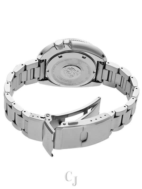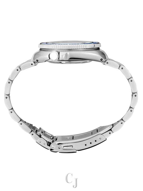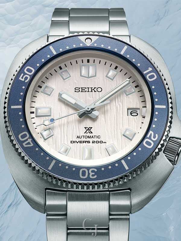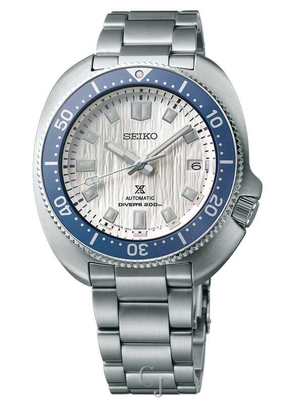 1970 Heritage Diver’s Save the Ocean Special Edition. Designed for those who treat life as the ultimate adventure, the Seiko Prospex line meets every challenge with technological excellence and style. Part of a rich legacy of innovation in high-intensity timekeeping, Prospex continues to celebrate a long history of sports watch excellence with re-creations and re-interpretations of landmark achievements. With contemporary styling and technology, this versatile timepiece reimagines Seiko’s famed 1970 diver’s watch, complete with the iconic case design that revolutionized underwater safety with a recessed crown creating a built-in crown guard at 4 o’clock. Inspired by the intricacies of glacial formation, this Special Edition is themed to evoke the ice of Arctic regions, including the North Pole, where legendary adventurers such as Naomi Uemura relied on Seiko diver’s watches to meet every challenge. Today, it advances that unique history in support of the Seiko “Save the Ocean” campaign, dedicated to marine conservation. This masterfully updated design is crafted of stainless steel with super-hard coating, and includes a curved anti-reflective sapphire crystal, blue uni-directional rotating elapsed timing bezel, and screwdown crown and caseback. The patterned white dial features a date calendar and LumiBrite hands and markers. Following ISO standards for scuba diving to depths of up to 200 meters, this exceptional watch offers manual winding capability and includes a 24-jewel automatic movement with a frequency of 21,600 vibrations per hour and a power reserve of approximately 70 hours. 200m Water Resistant.