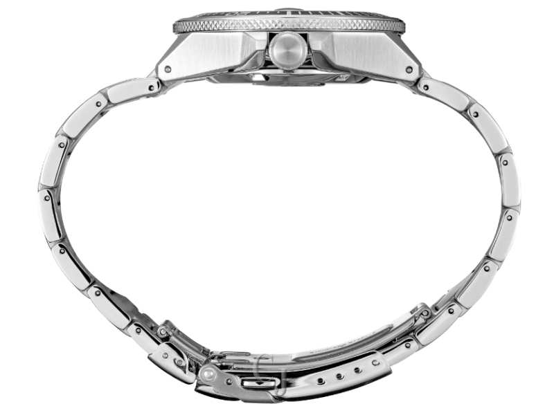 Prospex Special Edition Automatic Diver. Designed for those who treat life as the ultimate adventure, the Seiko Prospex line meets every challenge with technological excellence and winning design. Inspired by Seiko’s most iconic diving styles, this distinctive Special Edition evokes the world view of a manta ray with the gradated blue of the dial suggesting the variations in sunlight as it penetrates deep into the ocean, heightened by a stamped pattern suggesting waves. For reliable timing in rough waters, the 23-jewel automatic movement beats at a frequency of 21,600 vibrations per hour, with a power reserve of approximately 41 hours, and can be wound manually or automatically. With magnified date calendar and LumiBrite hands and markers, the dial is framed by a black ceramic one-way rotating elapsed timing bezel. This high-intensity timepiece, in stainless steel, with secure screwdown crown and caseback, and anti-reflective sapphire crystal, follows ISO standards for scuba diving. 200m Water Resistant