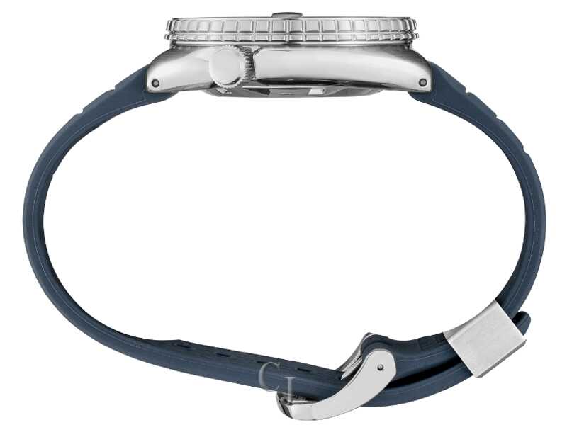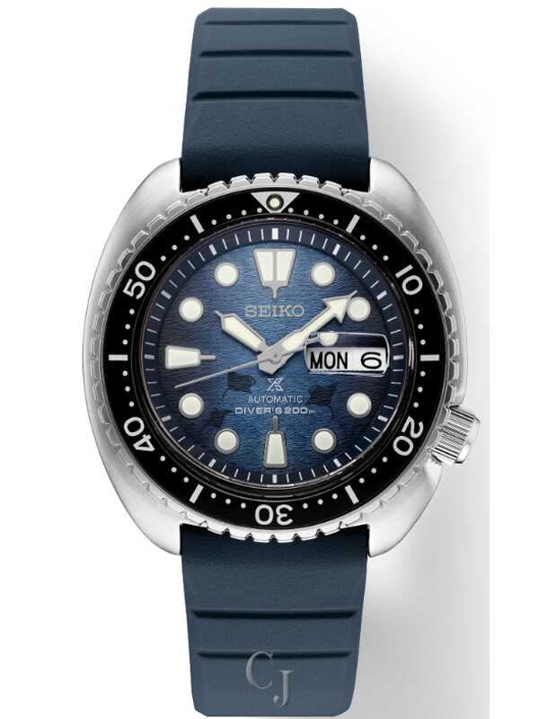 Prospex Special Edition Diver. Designed for those who treat life as the ultimate adventure, the Seiko Prospex line meets every challenge with technological excellence and winning design. Inspired by Seiko’s most iconic diving styles, this distinctive Special Edition evokes the world view of a manta ray with the rich, dark gradated blue of the dial suggesting the variations in sunlight as it penetrates deep into the ocean, heightened by a stamped pattern suggesting waves. For reliable timing in rough waters, the 24-jewel automatic movement beats at a frequency of 21,600 vibrations per hour, with a power reserve of approximately 41 hours, and can be wound manually or automatically. Featuring a magnified day/date calendar and LumiBrite hands and markers, the dial is framed by a black ceramic uni-directional rotating elapsed timing bezel. In stainless steel, with secure screwdown crown and caseback, anti-reflective sapphire crystal and deep blue silicone strap, this high-intensity timepiece follows ISO standards for scuba diving. 200m Water Resistant
