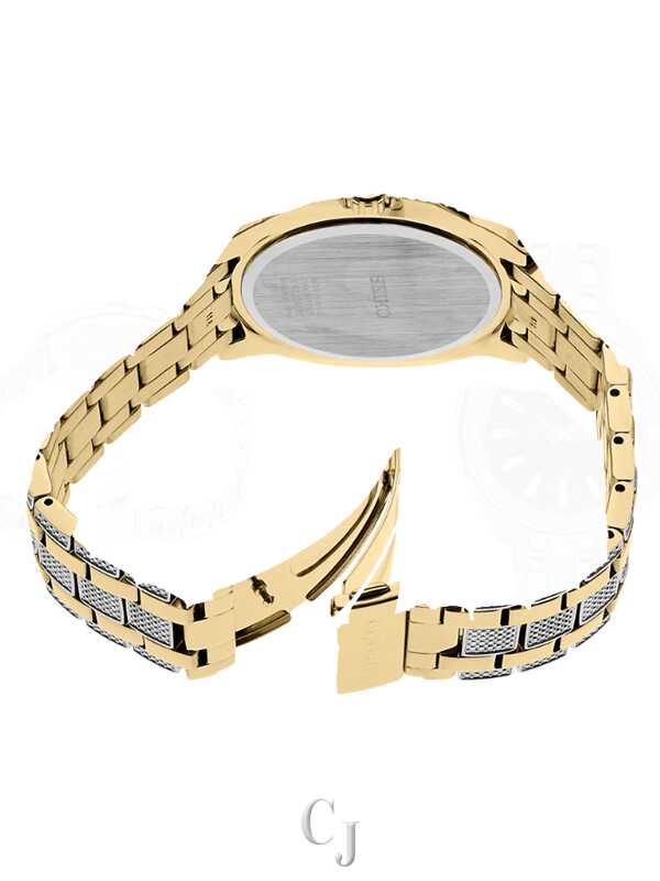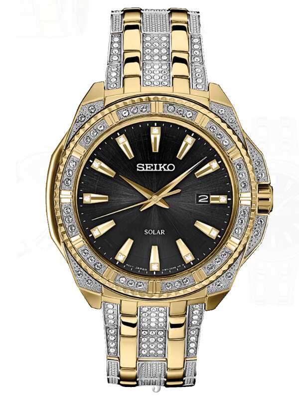 Gold-tone stainless steel case with a gold-tone stainless steel bracelet set with Swarovski crystals. Fixed gold-tone bezel set with Swarovski crystals. Black dial with gold-tone hands and crystal-tipped index hour markers. Minute markers around the outer rim. Dial Type: Analog. Date display at the 3 o’clock position. Seiko caliber V157 eco-drive movement. Scratch resistant Hardlex crystal. Pull / push crown. Solid case back. Round case shape. Case size: 44.5 mm. Case thickness: 10 mm. Band width: 21 mm. Fold over clasp with a push button release. Water resistant at 30 meters / 100 feet. Functions: date, hour, minute, second, solar-powered. Additional Info: powered by light energy – no battery change required. Dress watch style. Watch label: Japan Movt. Seiko Essentials Crystal Solar Powered Black Dial Two-Tone Men’s Watch SNE458.