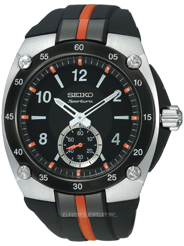 Seiko SRK025 Sportura Two Tone Rubber Black Dial Men’s Quartz Watch Seiko SRK025. The Seiko SRK025 Sportura Two Tone Rubber Black Dial Men’s Quartz Watch features a round black dial, silver tone hands and hour markers. All of these are framed in a stainless steel case, fixed bezel, and scratch resistant sapphire crystal. It also offers a black rubber strap secured with push button clasp, Japanese quartz movement and water resistance up to 100meters/330feet. Features: Brand: Seiko Collection: Sportura Model number: SRK025 Case Shape: Round Dial window