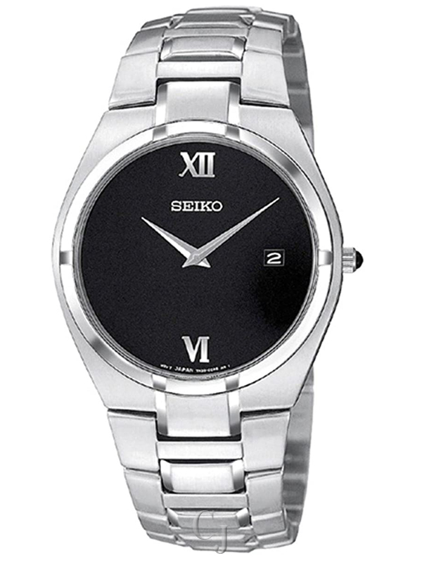 Seiko Watch: Seiko SKP293 Men’s watch features a brushed finish stainless steel case with push and pull crown. This great watch also comes with high quality Japanese quartz movement, highly scratch resistant hardlex crystal, water resistant up to 30 meters, 8 1/4 inches brushed finish stainless steel bracelet with deployment clasp and black dial with date display, silver tone hands and Roman numerals.