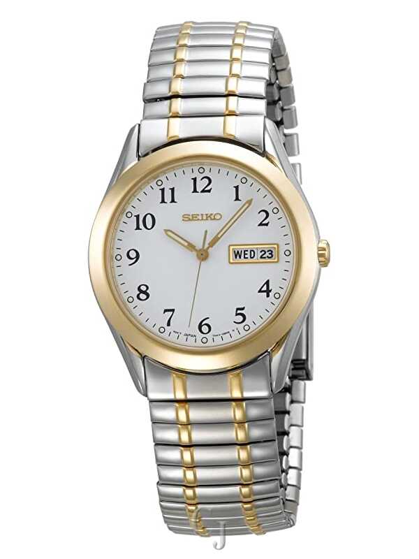 This attractive Seiko SGG740 men’s watch features two tone gold plated stainless steel case and expansion bracelet. This great watch also comes with high precision quartz movement, highly scratch resistant hardlex crystal, water resistant to 30 meters and white dial with day-date display, luminous hands & black Arabic numerals.