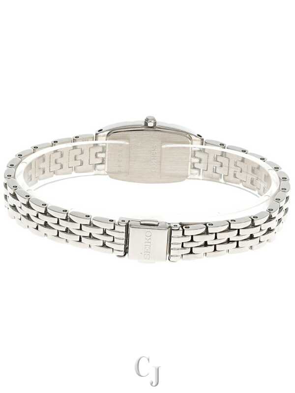 Seiko SUP154 Dress Solar women’s watch features a 19mm wide and 7mm thick two tone rose gold ion plated solid stainless steel case with 18 diamonds accented fixed bezel and textured push-pull crown. Seiko SUP154 is powered by Japanese quartz solar powered movement. This beautiful watch also features a mother of pearl dial with rose gold tone luminous hands and index hour markers, scratch resistant hardlex crystal and water resistant to 30 meters.