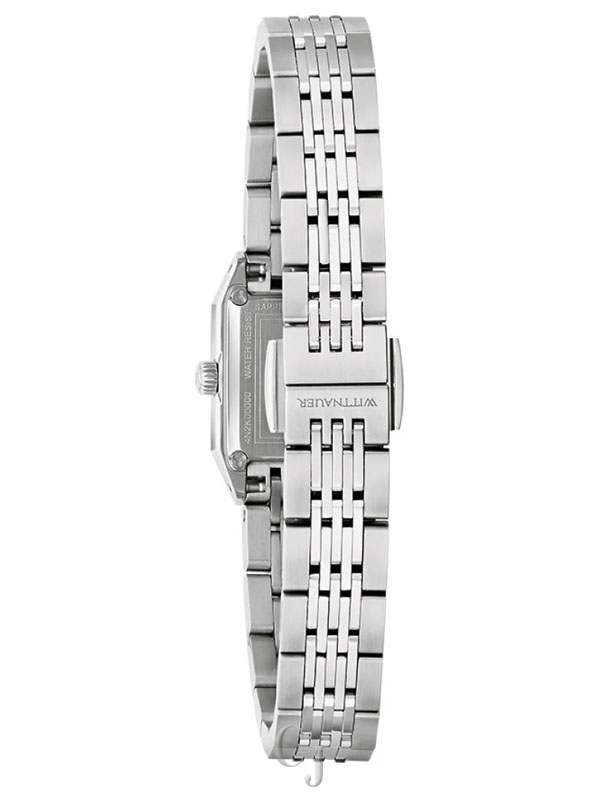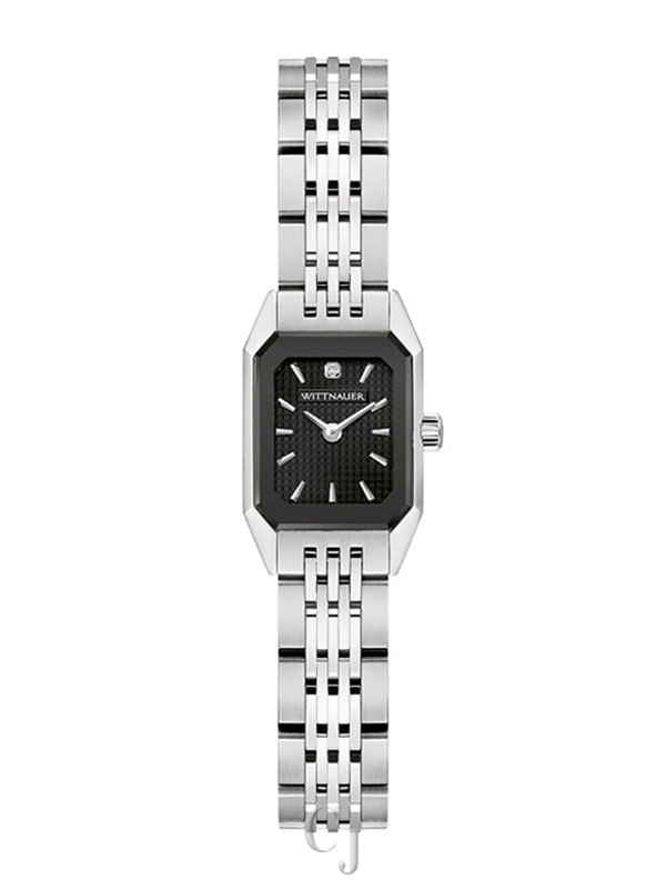 The Wittnauer Women’s Black Rectangular Diamond Dial Stainless Steel Watch embodies refined sophistication and modern luxury. Its black rectangular dial is accented with natural diamond hour markers, creating a striking contrast against the silver-tone stainless steel case and bracelet. Protected by a scratch-resistant sapphire crystal, this elegant timepiece is powered by a precise quartz movement for reliable accuracy. The stainless steel bracelet with a secure deployment clasp ensures a comfortable and polished fit, while 50-meter water resistance adds everyday practicality. A timeless design that captures Wittnauer’s signature craftsmanship and diamond-accented elegance.