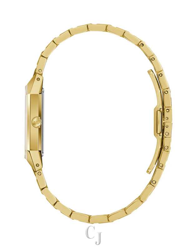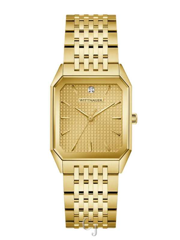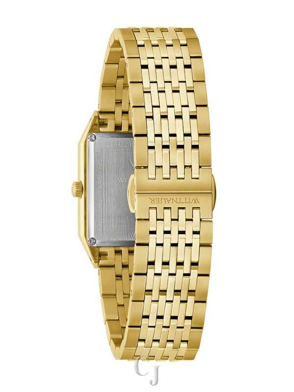 The Wittnauer Men’s Diamond Accent Champagne Dial Gold-Tone Rectangular Watch WN3112 exudes timeless sophistication and modern luxury. Featuring a champagne dial adorned with natural diamond accents, this elegant design is housed in a gold-tone rectangular stainless steel case that reflects Wittnauer’s signature craftsmanship. A scratch-resistant sapphire crystal preserves the dial’s brilliance, while a matching gold-tone stainless steel bracelet and push-button deployment clasp provide a seamless, comfortable fit. Powered by a precise quartz movement, this watch blends refined style with reliable performance—an ideal statement piece for the distinguished modern man.