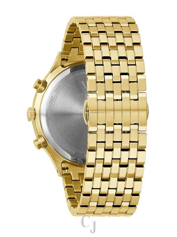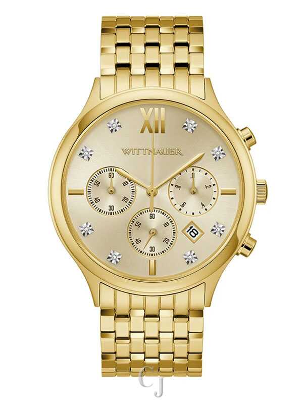The Wittnauer Men’s Black Tie 44MM Diamond Dial Gold-Tone Chronograph Watch WN3109 exemplifies bold sophistication and precision craftsmanship. Featuring a champagne dial adorned with natural diamond hour markers, this timepiece blends elegance with functionality through its chronograph subdials and precise quartz movement. The gold-tone stainless steel case and bracelet create a sleek, polished profile, secured with a push-button deployment clasp for lasting comfort. Protected by a scratch-resistant sapphire crystal and water resistant to 50 meters, this chronograph showcases Wittnauer’s signature craftsmanship and luxurious design, elevating every occasion with refined distinction.