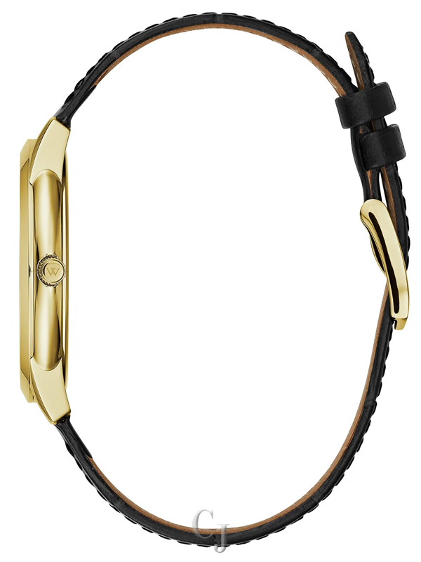 Continental flair meets streamlined design. Handsomely elegant with a double-diamond index at 12 o’clock on a silver-white dial with gold-tone accents and three-hand date feature. Housed in a slim-line snap-back gold tone case and black leather strap with buckle closure.