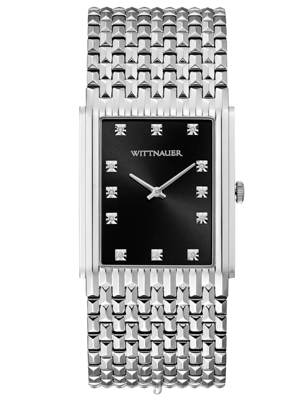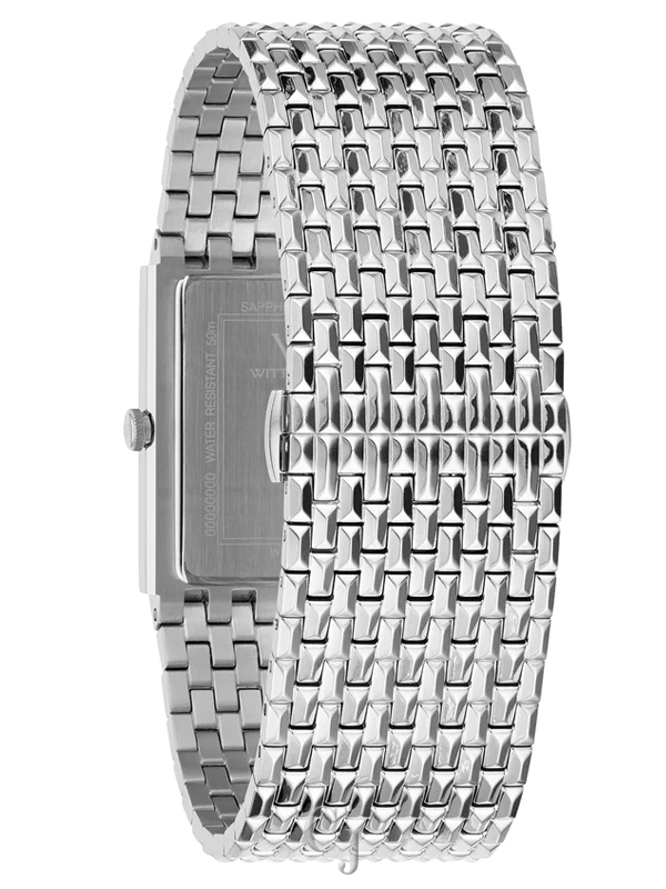 Cosmopolitan with a vintage flair, with 12 diamond markers set on a jet-black dial accented with silver-tone hands. From the fluidity of the high-polish stainless steel faceted links of the bracelet to the bevel edges of the slim rectangular case, this timepiece feels truly luxurious on the wrist; with sapphire crystal and double-press deployant closure.