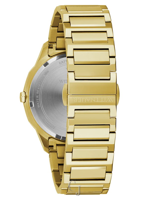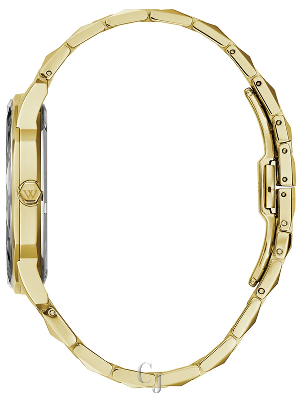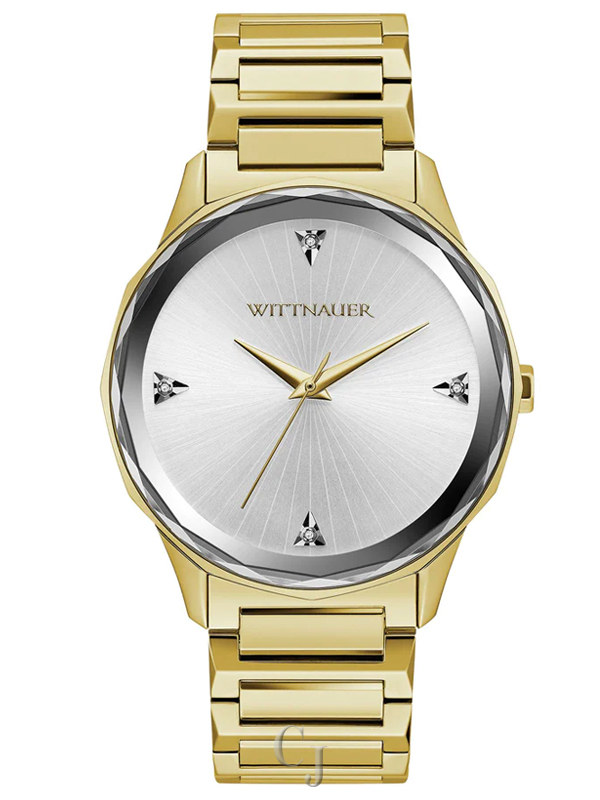 Adding a new dimension to style and time, 4 triangle-shaped diamond markers and gold-tone hands punctuate a silver-white dial with sunray texture detail. The striking faceted sapphire crystal has edge-to-edge silver-tone metallization and screw-down case back.