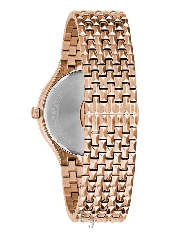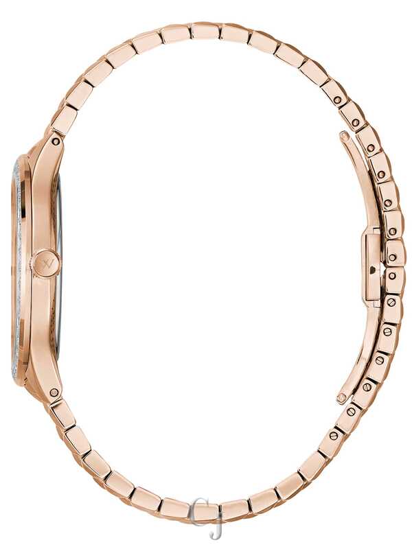 Luxurious and elegant with a halo of 40 hand-set diamonds outlining a white mother-of-pearl dial accented with Roman and faceted indexes for a subtle shimmer. The high polish rose gold-tone stainless steel faceted link bracelet is reminiscent of a fine jewelry piece. Features a scratch-resistant sapphire crystal and double-press deployant closure.